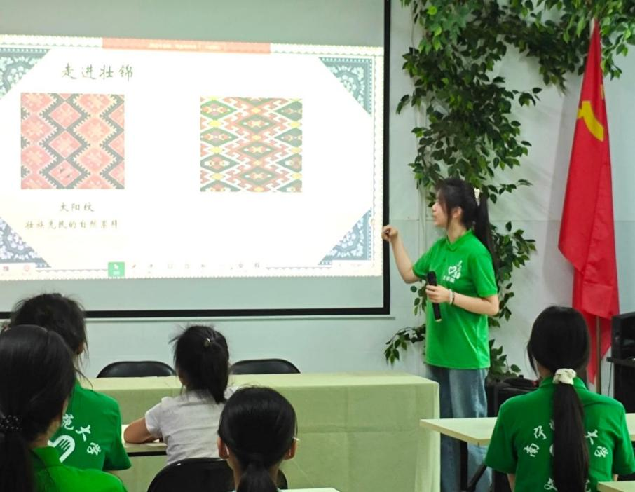 本期义务家教活动的主要内容是展现民族服饰风情。课堂上,教员们借助PPT向小朋友们展示壮锦图案样式与寓意,从壮族拓展到各少数民族服饰文化,苗族银饰、藏族氆氇等服饰文化引起了小朋友们的好奇心。教员们通过PPT小游戏展示服饰图片和实物细节,开展民族名称抢答活动,小朋友们踊跃抢答,现场气氛热烈。最后,志愿者们分发填色图纸,开展“我为民族服饰添色彩”绘画活动,小朋友们发挥想象力,为民族服饰勾勒五彩颜色,在创作中感受民族文化魅力,并现场分享自己的绘画理念以及对民族文化的理解。