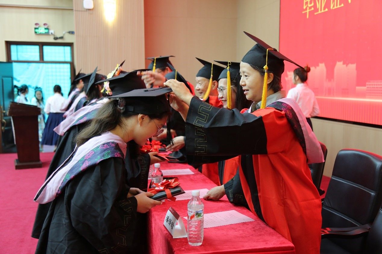 在典礼的最后,学院领导和老师们为毕业生们一一正冠拨穗,颁发毕业证书。毕业生们身着学位服,手持证书,脸上洋溢着喜悦和自豪,现场充满了温馨而感人的氛围。