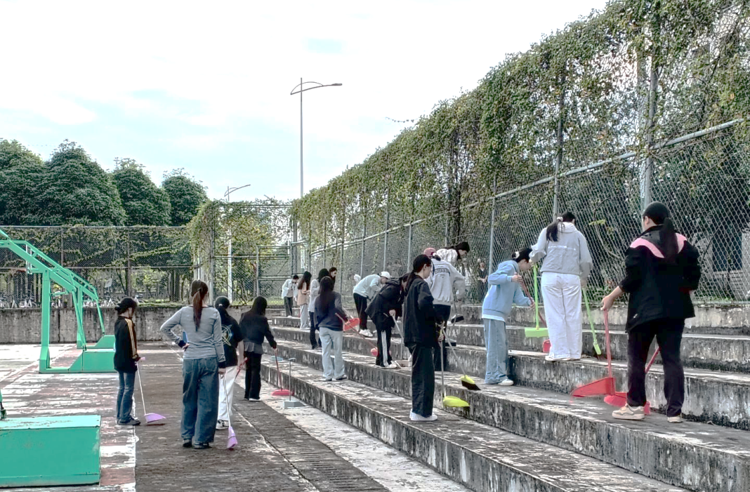 活动当天,各班劳动小组组长带领组员前往文理综合楼附近的校道、篮球场旁的台阶、理综楼旁的人行道,开始清扫工作。同学们对落叶、纸屑、塑料瓶等垃圾进行彻底清理,针对墙角、绿化带边缘等卫生死角,大家弯腰俯身、细致排查,用夹子捡拾藏匿的杂物,用抹布擦拭宣传栏、指示牌上的灰尘。