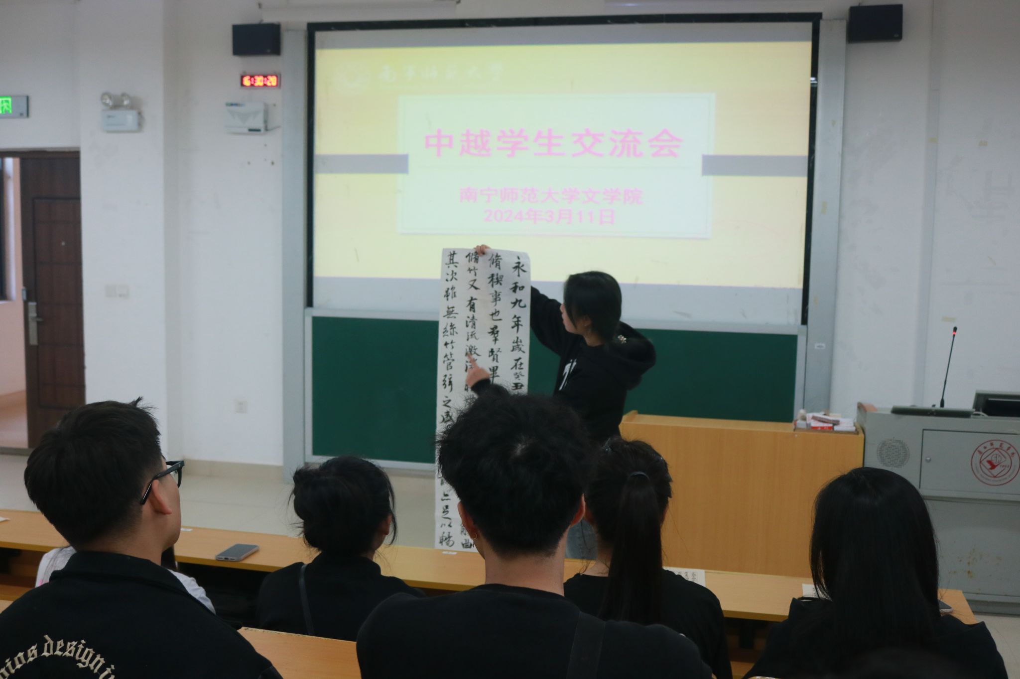 学生在交流会现场向越南朋友发放由学院学生书写的毛笔字,胡语同学介绍了中国书法遵循从右往左写的规律,以其中一篇书法作品《赤壁赋》讲解了中国古代文人墨客的潇洒与自由,同时也向大家展示了中华汉字的独特魅力。