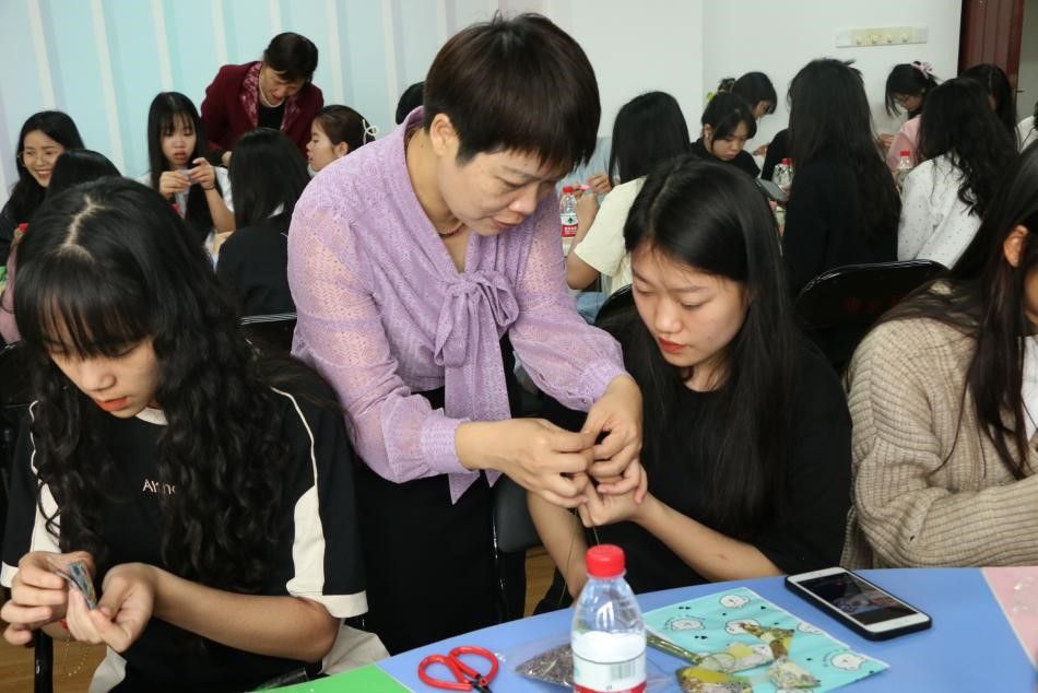 本次活动分为三部分内容——上一堂传统文化课、学一项民族手工、品一次广西美食。梁谷子老师绘声绘色地讲述了广西三月三的由来与“歌仙”刘三姐的故事,让大家对广西民俗文化有了更加清晰的了解。初等教育学院非遗手工课杨帆老师、关工委缪军老师、钟焱老师现场指导在场中越学生制作壮锦香囊,香囊作为中国传统文化的重要组成部分,代表着人们对美好生活的期许,同时也承载了四虎影院