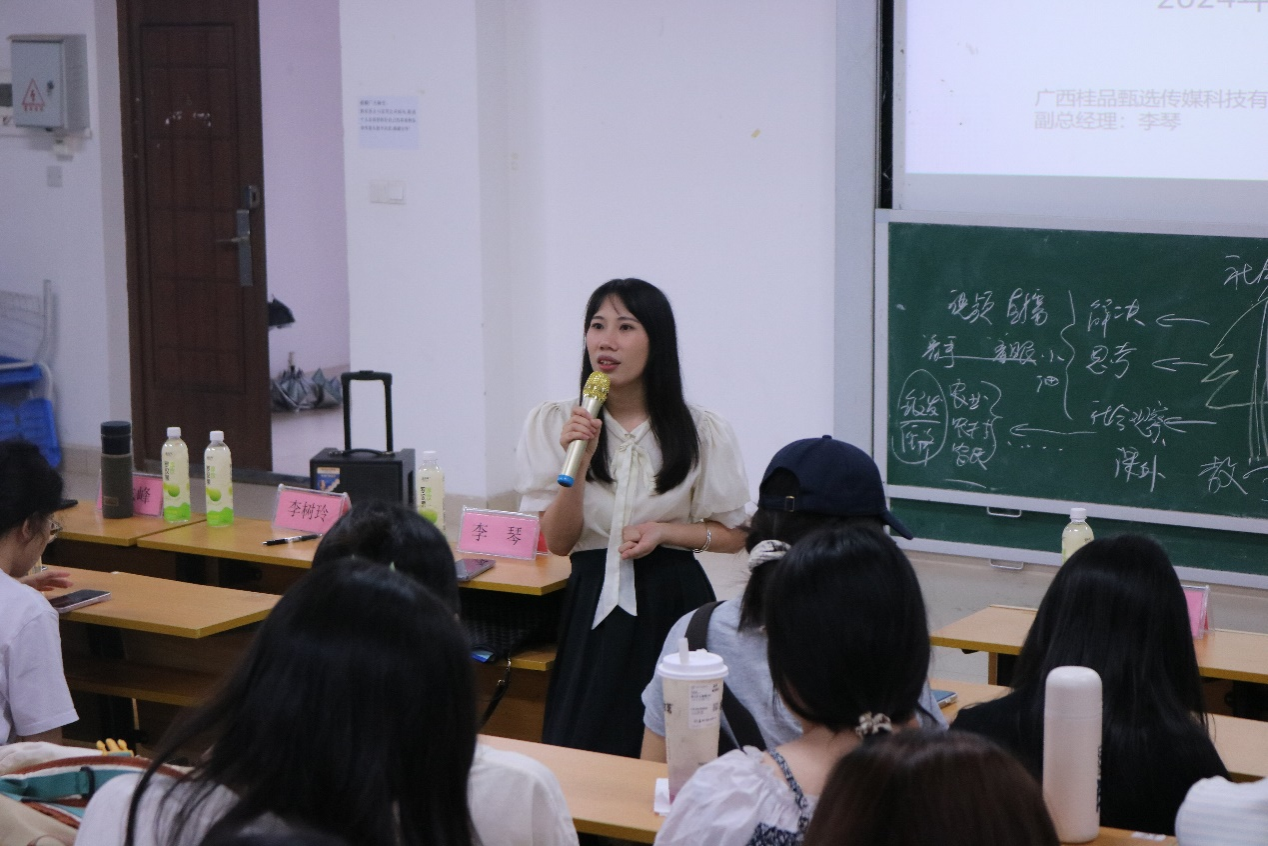 创新创业基地指导老师李志峰及广西桂品甄选传媒科技有限公司李琴、李翔岳经理出席本次宣讲会。