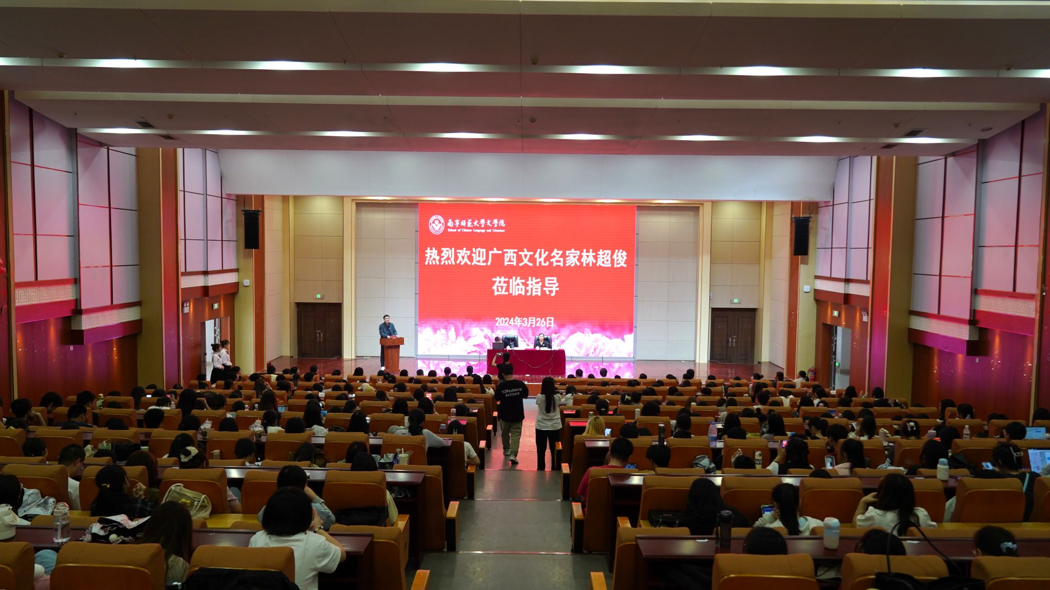 聘任仪式结束后,林超俊秘书长为到会师生作了题为《奋斗的青春更壮美——时代楷模黄文秀的人生启迪》的报告。报告中,他结合自己的创作,从“学文秀 悟优秀”、“学文秀 当优秀”、“学文秀 传文化”、“学文秀 不作秀”、“学文秀 增本领”以及“做奋发有为的当代大学生”六个方面向我们讲述了黄文秀的15个生动故事,并和大家探析传承优秀传统文化的重要价值。在互动环节,同学们积极提问,林超俊秘书长给予了详细和耐心的解答,他倡导同学们要将课堂中学到的知识和报告的内容进行融会贯通,心中有阳光,脚下有力量,他希望同学们结合专业特长,认真领会、理解和学习黄文秀精神,争做有理想、有担当、有本领的“黄文秀式好青年”。