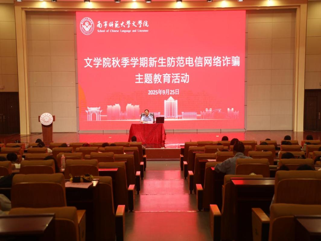 于9月25日晚上在文科综合楼114报告厅举行新生反诈专题教育讲座。此次讲座由南宁市仙葫派出所于佑警官主讲,2025级全体同学参加。