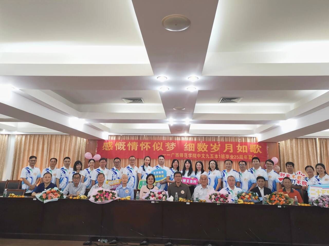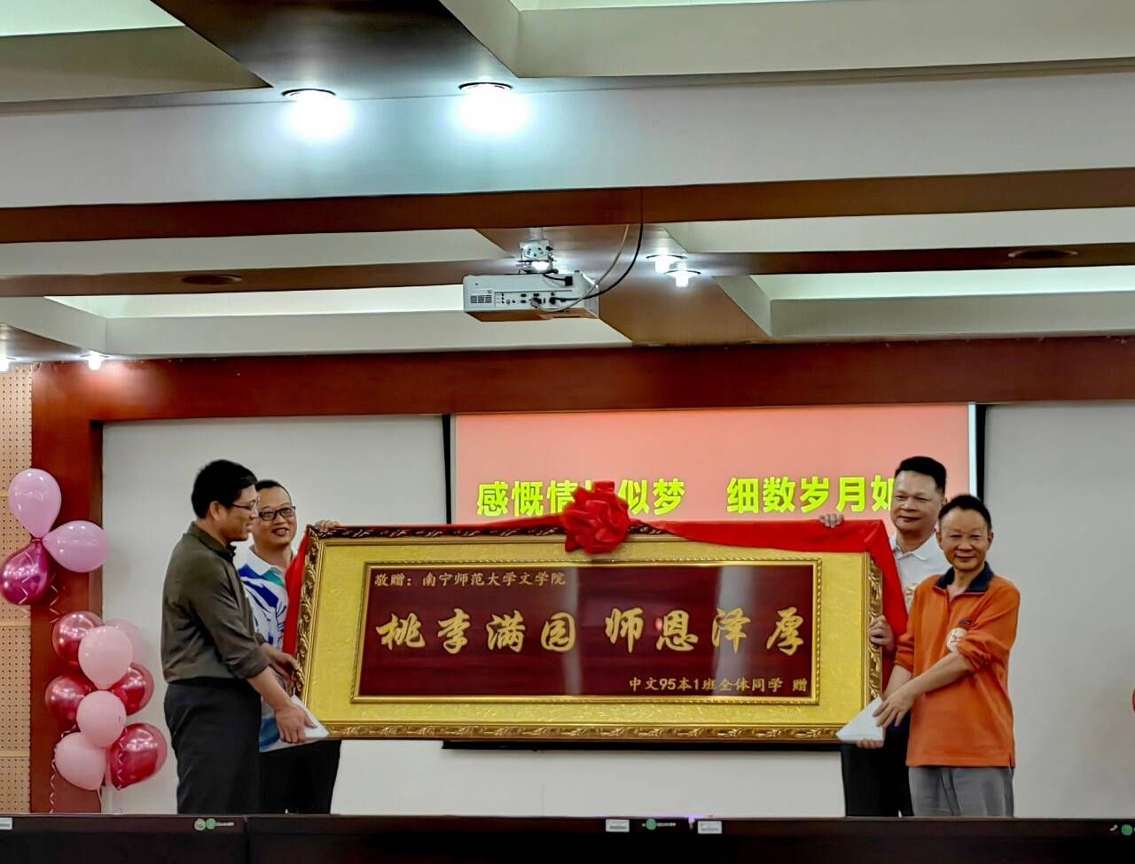 敬赠“桃李满园,师恩泽厚”牌匾并向参加座谈会的全体老师行谢恩仪式。北部湾高中的语文特级教师、正高级教师龙明洲代表全班同学做了题为《二十五载重聚首,母校恩情永存心》的主题发言,班主任宾恩海教授做了“我们一起向青春致敬”的主旨发言,校友们在现场再次聆听了大学恩师的教诲。每一位同学也情不自禁地分别向母校领导和老师汇报自己二十多年的工作业绩,大家感念学生时代的文学生活和为理想而充满激情去奋斗的美好往事,流露出对恩师的牵挂与感激,真切表达对母校的感恩与祝福。