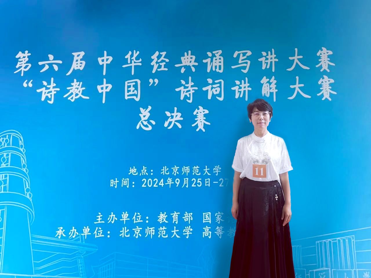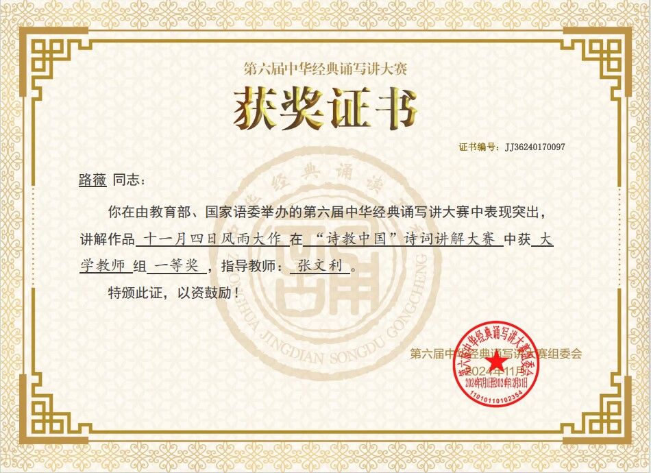 教师路薇在大赛中表现突出,讲解作品《十一月四日风雨大作》在“诗教中国”诗词讲解大赛全国总决赛中荣获大学教师组一等奖。