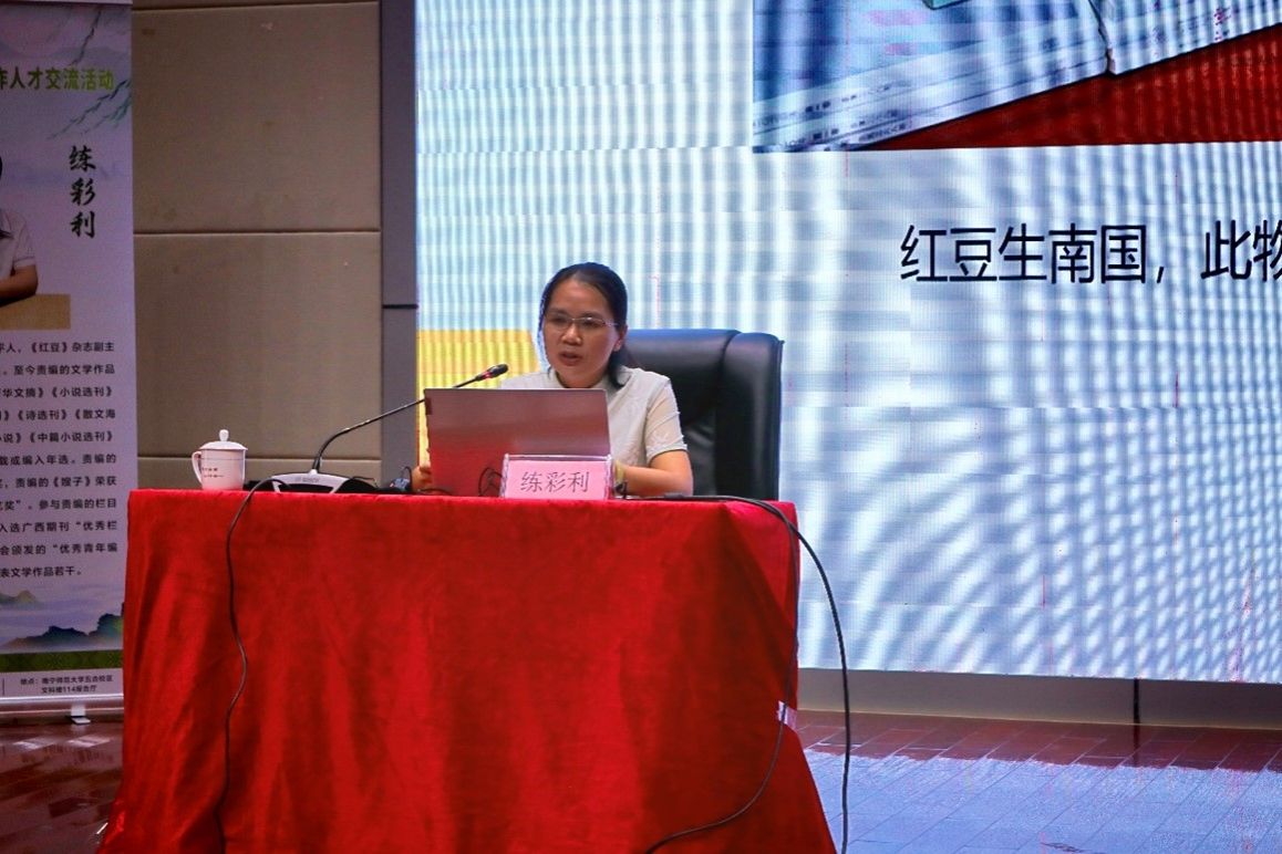 教授陈祖君从广西新近获得全国少数民族文学创作骏马奖的三部作品谈起,为大家作了《文化研究理论对文学创作的影响》的报告;《红豆》杂志副主编练彩利对《红豆》杂志社进行了详尽的介绍,并分享了文学期刊的投稿方式以及投稿的注意事项,为准备投稿的文学爱好者提供了宝贵的指导。